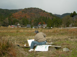 11月29日、滋賀県の在原の里へ日帰り写生会に行ってきました。 在原はわら葺き屋根の住宅がある懐かしい景色を残した村です。途中、メタセコイアの並木道にも立ち寄りました。 在原では、紅葉に色づき始めた山々を背景に、藁ぶき屋根の家並みを写生しました。午前中はよかった天気は午後から崩れ始めましたが、天候によって変化する村の表情を見ることができました。